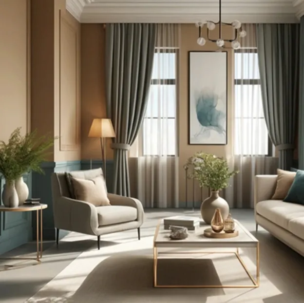 L’abbinamento è con i colori neutri e chiari di divano, poltrona, tende e tappeti, quali il panna e il grigio perla. Il verde salvia della boiserie nella parte inferiore delle pareti crea un bel contrasto che conferisce alla stanza un aspetto estremamente raffinato.