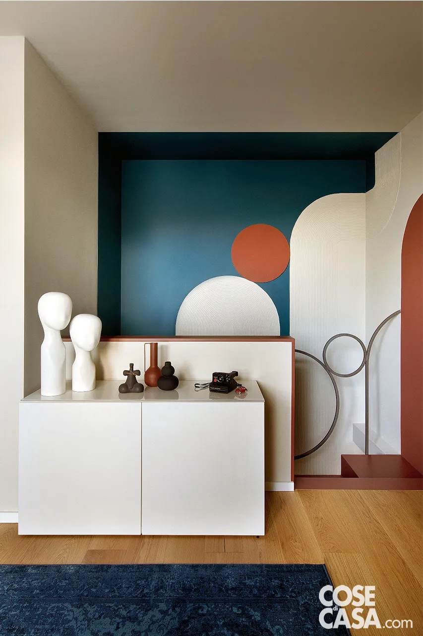 Ingresso con soffitto e parte del pavimento color terracotta più credenza nera. Progetto d’interior: Fabula Stories – Via Angelo Emo, 29 – Milano – Tel. 349/5360833 – ciao@fabulastories.com – fabulastories.com Foto: Riccardo Gasperoni. Clicca qui per vedere tutta la casa.