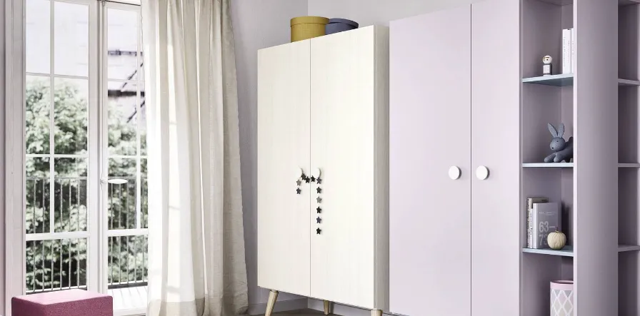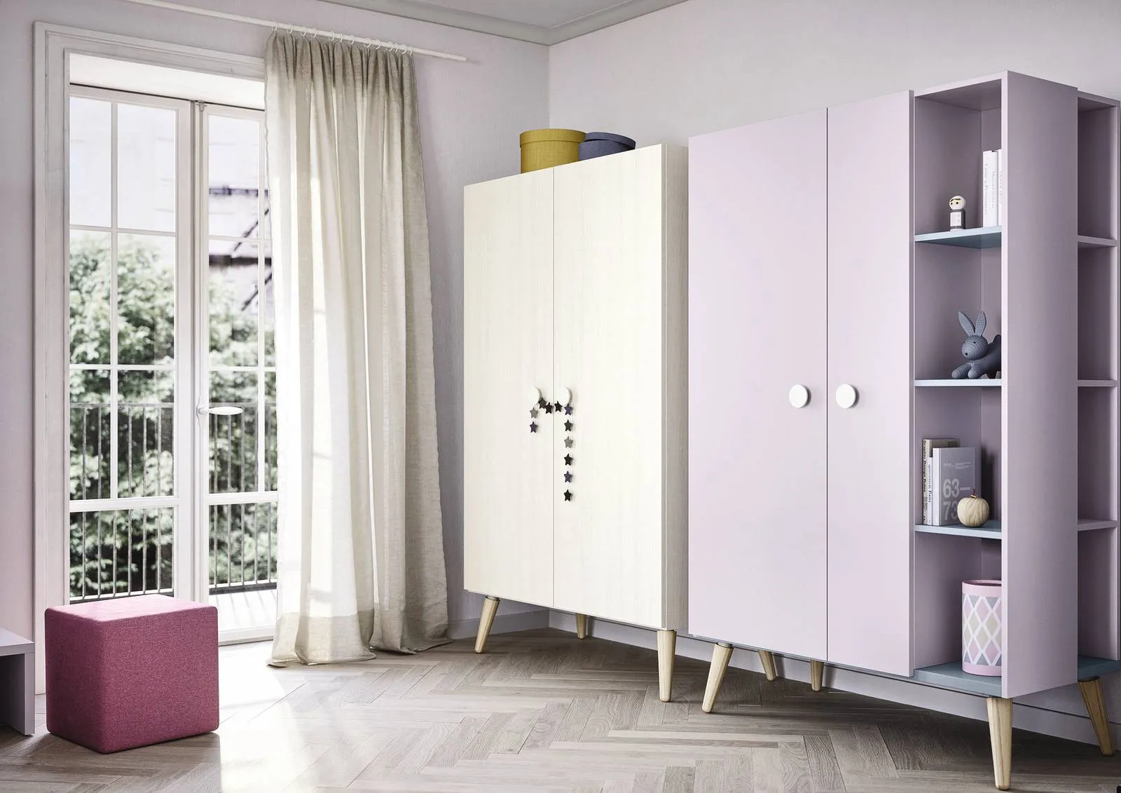 I due armadi Woody di Nidi, a due ante in nobilitato, poggiano su gambe coniche in legno che conferiscono grazia e leggerezza. Sono studiati per camerette di dimensioni contenute e sono integrabili anche ad altri arredi della collezione (sedie, madie, letti e scrivanie). Sono disponibili in due altezze e quattro configurazioni, possono essere attrezzati internamente con tubi appendiabiti in legno o in metallo e con ripiani e cassettiere. Esternamente è possibile inserire nel fianco dei vani contenitore per riporre libri, oggetti e giochi. Ogni componente può essere personalizzato nel colore e con ampia scelta di maniglie e pomoli in legno da combinare fra loro in diametri e cromie diverse. Misure L 120 x P 60,6 x H 189,7 o 208 cm. Prezzo bianco, a partire da 700 euro + Iva; lilla a partire da 982 euro + iva. https://www.nidi.it