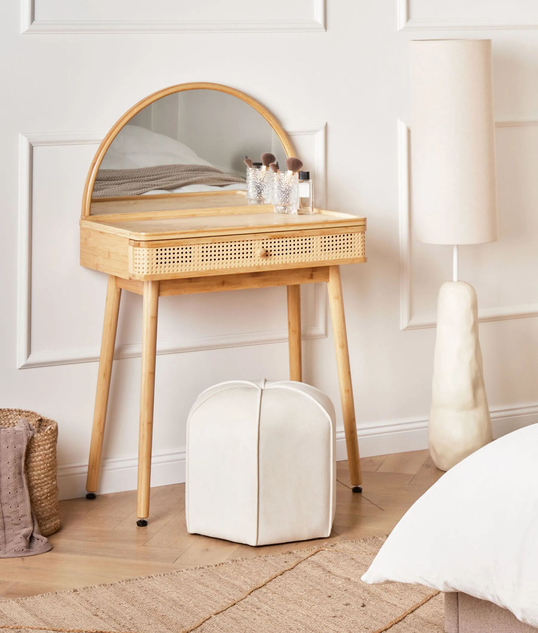 Legno di bambù naturale per la toeletta Rancheria di Beliani che permette di organizzare una zona trucco in un angolo della camera da letto semplicemente aggiungendo un pouf come seduta. Il cassetto integrato permette di riporre cosmetici, pennelli e accessori. Misura L 81 x P 41 x H 124 cm. Prezzo 249 euro. https://www.beliani.it