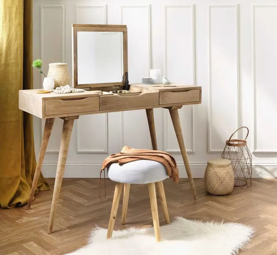 È facile da ambientare la toeletta dalle dimensioni contenute Clairoy di La Redoute Interieurs realizzata in MDF impiallacciato rovere che ne sottolinea lo stile scandinavo. Le gambe affusolate e il grande specchio arrotondato la rendono elegante e funzionale. Misura L 59 x P 43 x H 138 cm. Prezzo 249 euro. https://www.laredoute.it