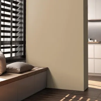 Questo colore è perfetto per dipingere le pareti della zona giorno, per rendere lo spazio accogliente e rilassante. In questo angolo della zona giorno, è stato scelto il color cachi per una singola parete: si tratta della pittura ColoreVivo 197Y di San Marco, lavabile a base acqua per interni. Perfetto l’abbinamento con il pavimento in parquet a sottolinearne la naturalezza e con il bianco della cucina retrostante.