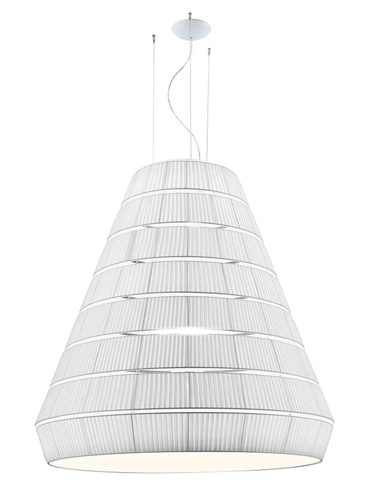 Splaye di Axolight ha la struttura in metallo e il paralume in tessuto fonoassorbente che permette di ridurre i rumori fino al 47%. Misura Ø 117 x H 133/433 cm e costa 4.890 euro + Iva. https://www.axolight.com