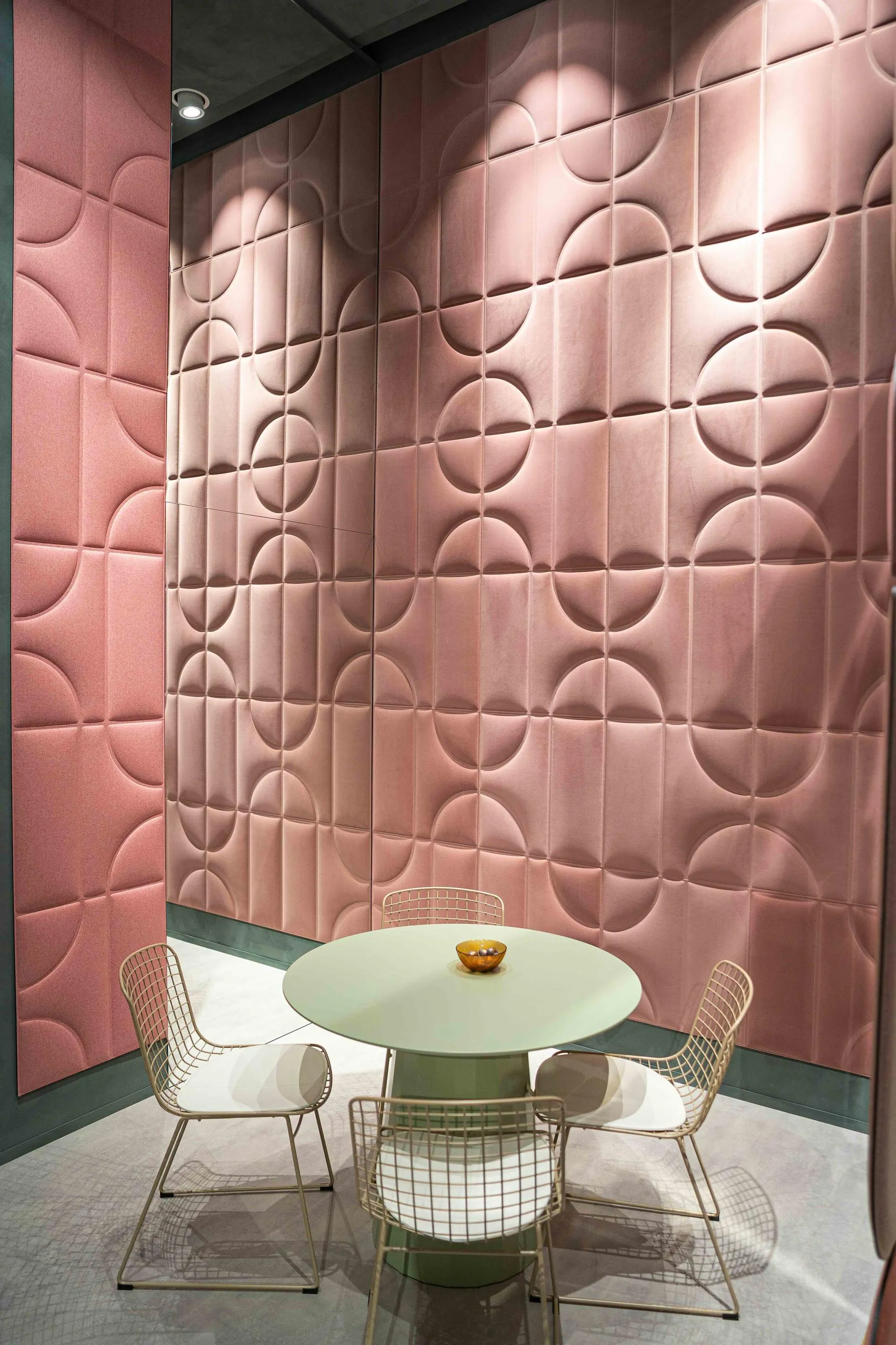 Rivestimento fonoassorbente per pareti Alma di Isolspace, che si ispira al contrasto che diventa armonia, agli opposti che si attraggono. Un intreccio di linee rette e curve che si uniscono a creare suggestioni sempre nuove e diverse. Si tratta di una piastrella fonoassorbente che permette di creare boiserie acustiche eleganti e raffinate, un rivestimento morbido e piacevole. Disponibile in quattro diverse palette di tessuti. https://isolspace.it/it/collezioni/panoramica-alma/