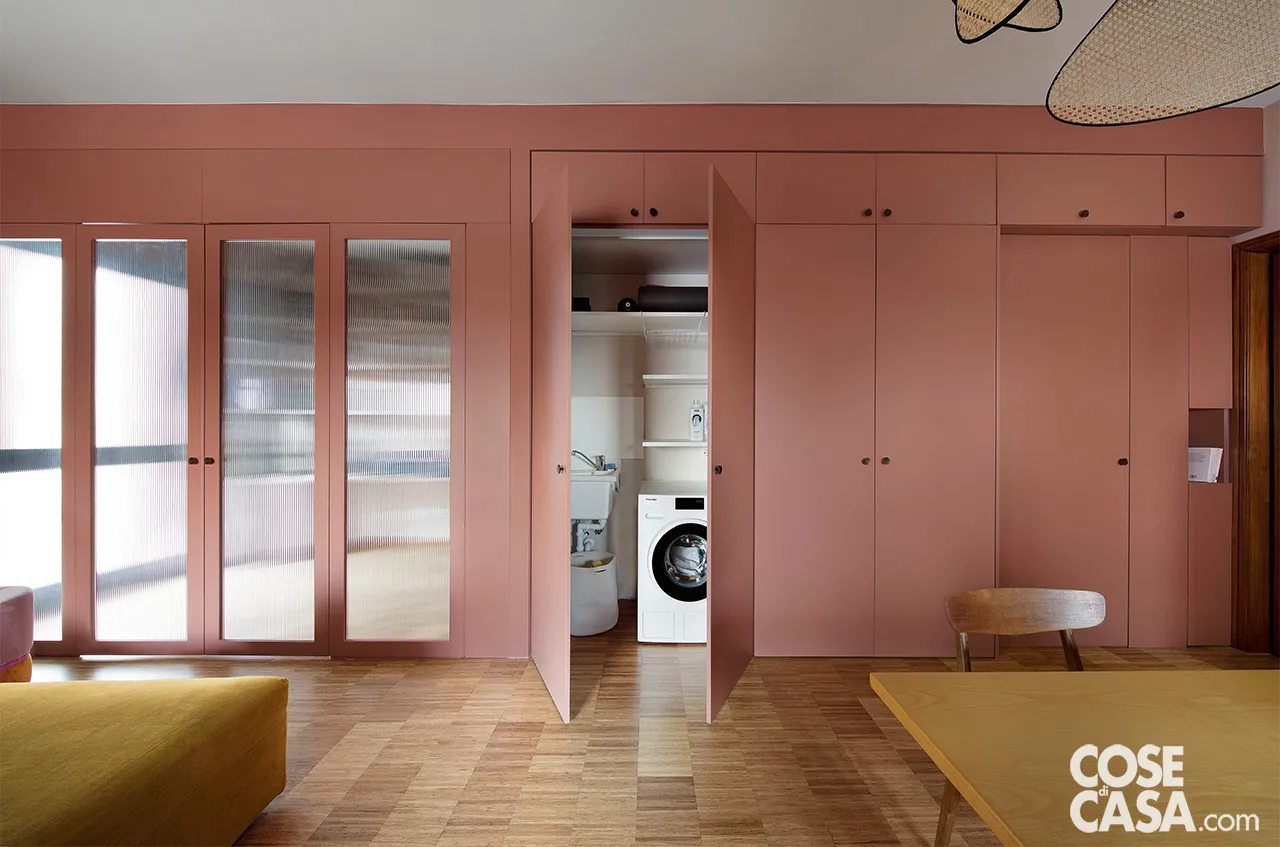 In questo open space, soggiorno, cucina, zona pranzo e – tutto a sinistra – e ingresso sono tutti in uno stesso ambiente ma ben definiti. A questi differenti ambiti funzionali si aggiungono anche quelli garantiti dall’ingegnoso sistema d’arredo multifunzione laccato rosa, che ingloba armadio, lavanderia e lo studio (dietro le porte vetrate).
