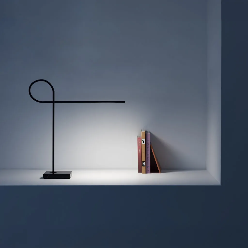 Sintesi (design Ernesto Gismondi) di Artemide, riedizione da tavolo di un modello di successo del 1975, si basa su componenti semplici e condivisi, che danno vita a una famiglia. La struttura è regolabile in inclinazione e altezza, composta da pochi elementi metallici curvati. Due profili a C di diversa lunghezza creano un supporto, che permette l’orientamento grazie a un semplice movimento di apertura e chiusura. https://www.artemide.com
