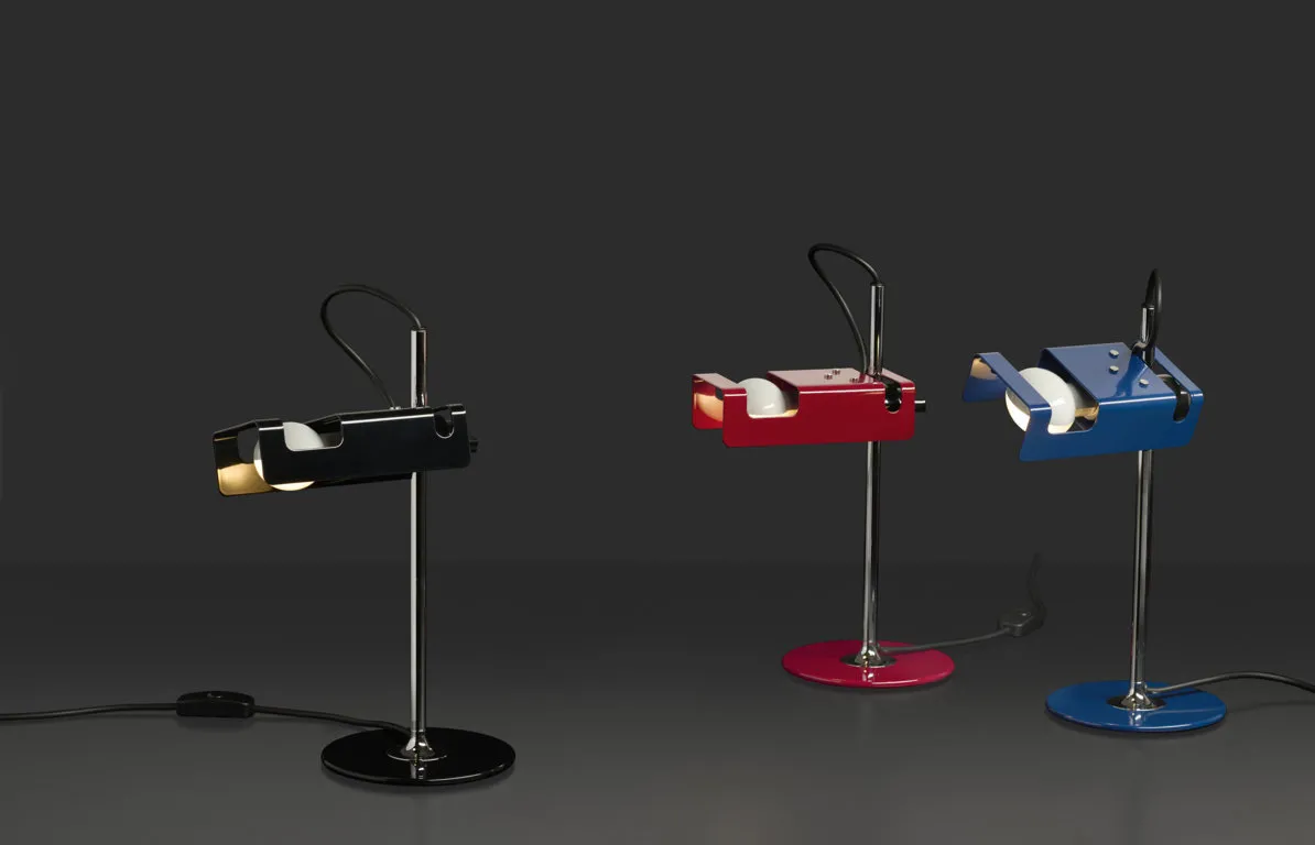 Mini Spider (design Joe Colombo) di Oluce è la riedizione da tavolo (Ø base 15 cm, L 19 x H 34 cm) della celebre lampada con “testa a martello” di metallo verniciato – disponibile in nero lucido, rosso Scarlet, blu – su asta verticale cromata. https://www.oluce.com