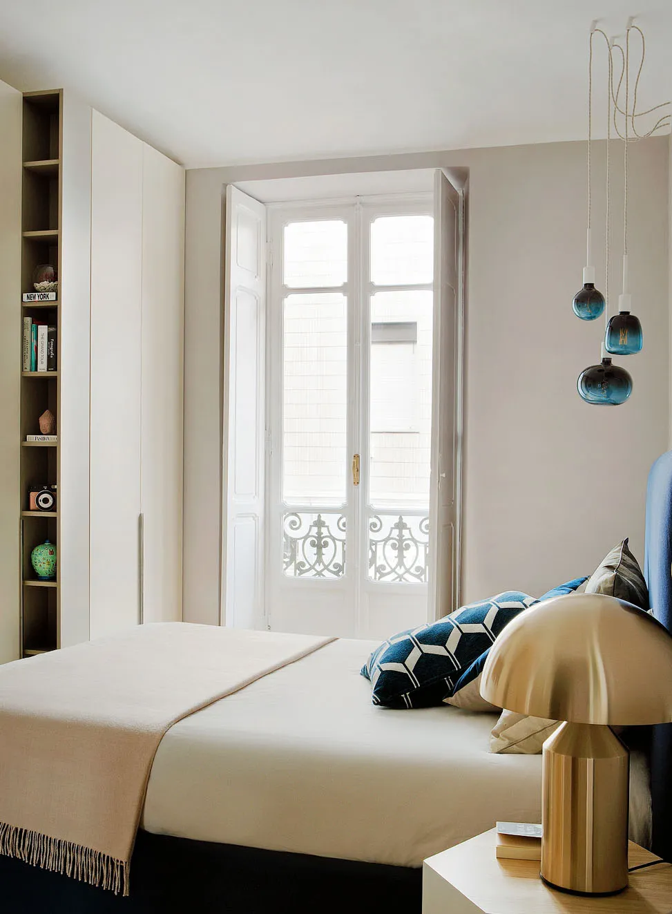 La scelta di porla su un comodino come abat-jour è bilanciata dall’uso, sull’altro lato, di un gruppo di sospensioni in vetro che bilancia pieni e vuoti. Un’idea efficace per valorizzare la stanza con la luce nella sua doppia essenza, tecnica e decorativa.