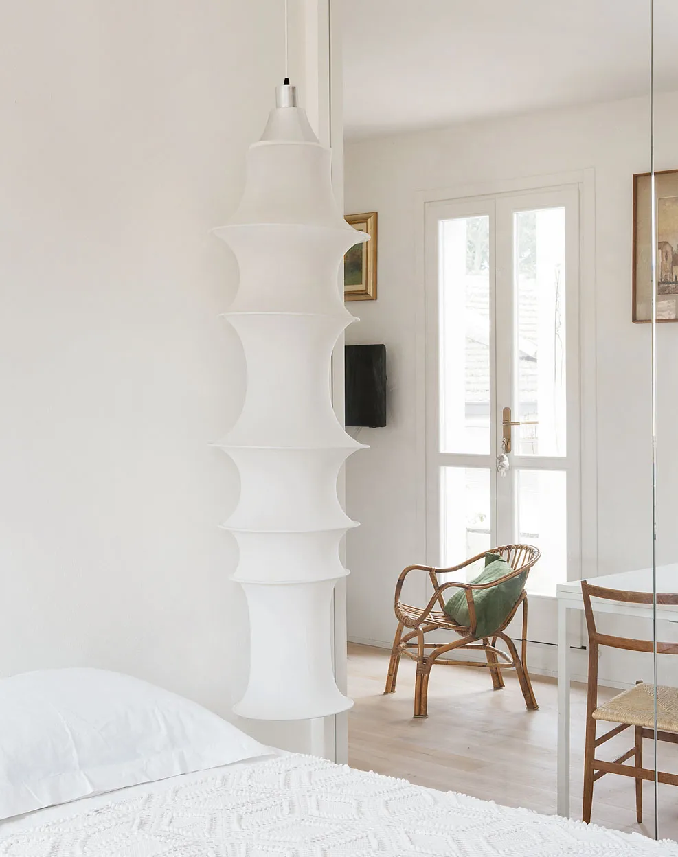 In ambienti total white o molto lineari, una sorgente con forme curve o materiali tessili aggiunge calore e una nota decorativa preziosa.