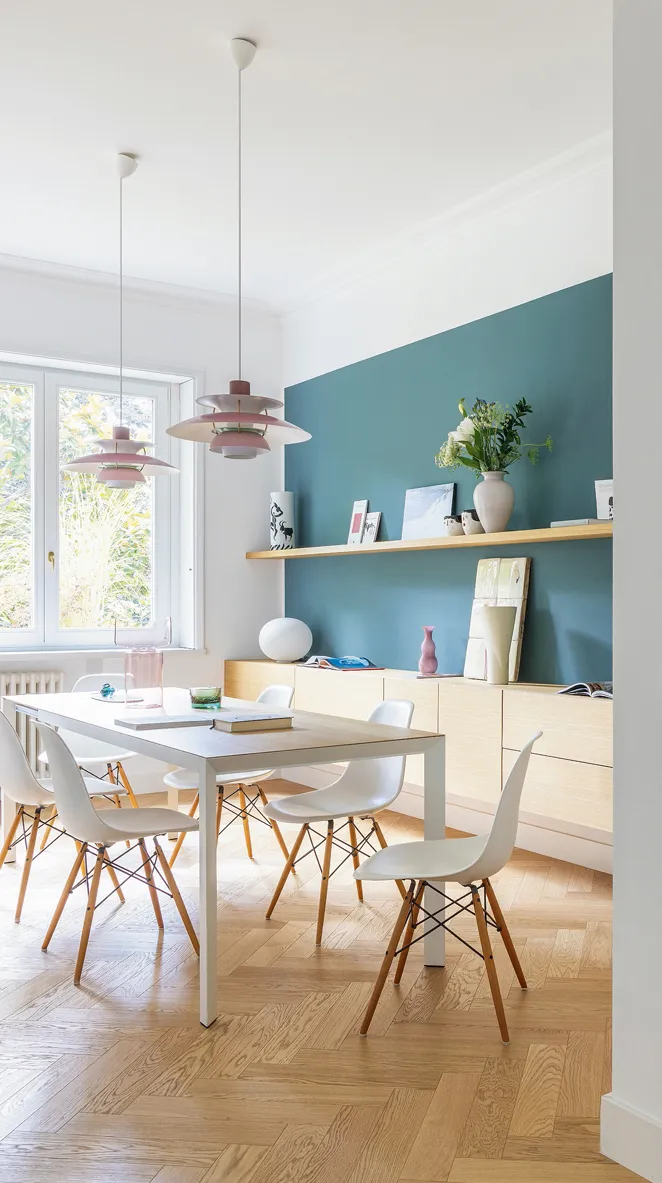 Qui, in finitura bicolore con tocchi di rosa, aggiunge un accento cromatico delicato che si armonizza con la zona pranzo. La disposizione in coppia dà equilibrio alla composizione e offre una luce ottimale a tutti i posti tavola.