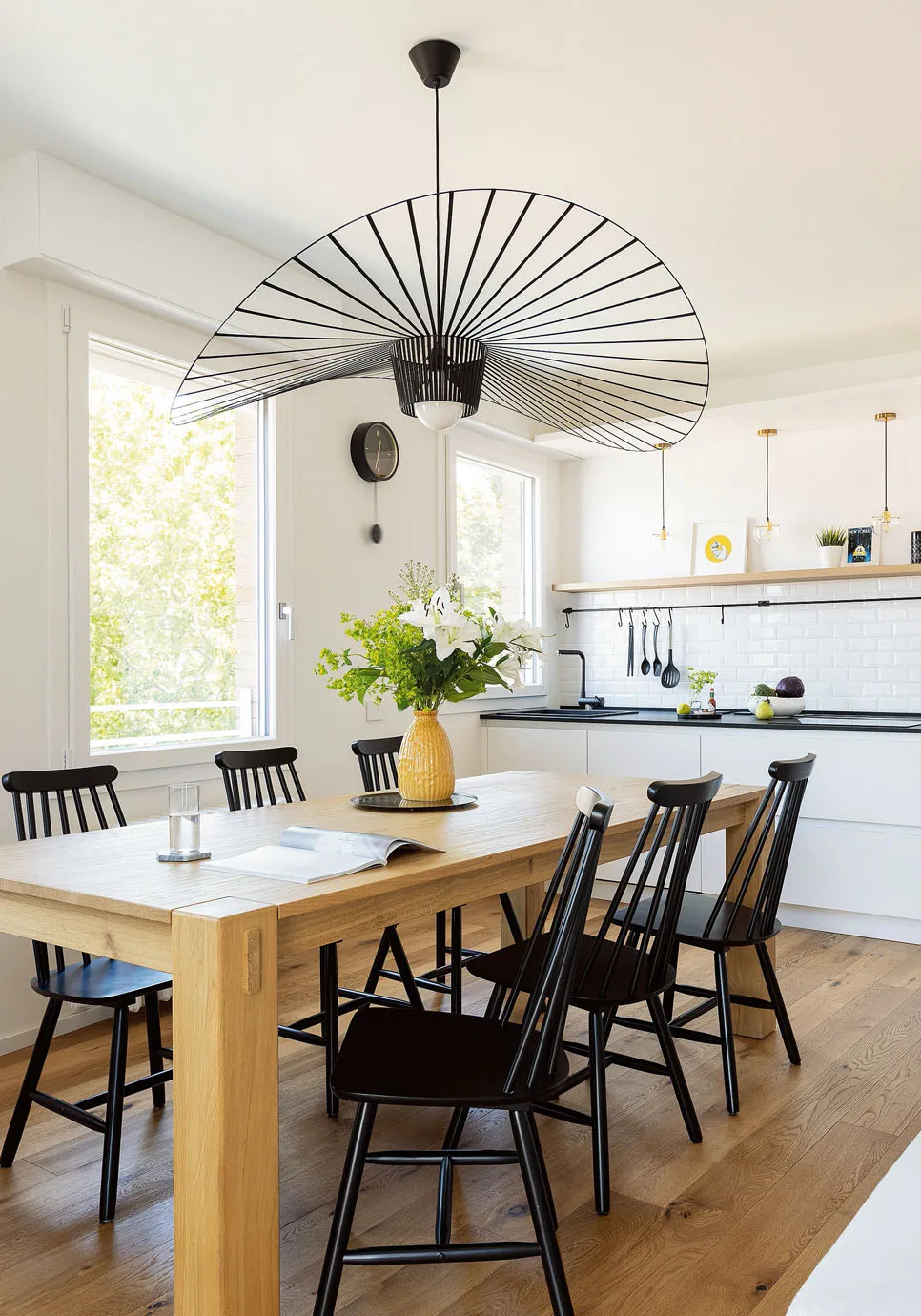 Linee grafiche e silhouette leggera: così il lampadario diventa un modello da copiare per cambiare l’atmosfera in cucina.