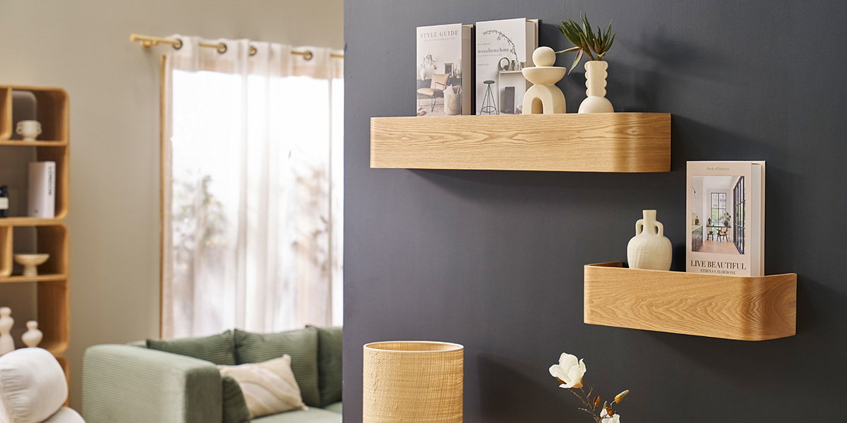 Hanno una linea curva le mensole Hope di Miliboo con la superficie decorata dalle venature del legno di frassino. Spiccano sulla parete scura grazie alla forma compatta e scultorea. Misurano L 48/90 x P 15 x H 13 cm. Prezzo a partire da 79,99 euro. https://www.miliboo.it