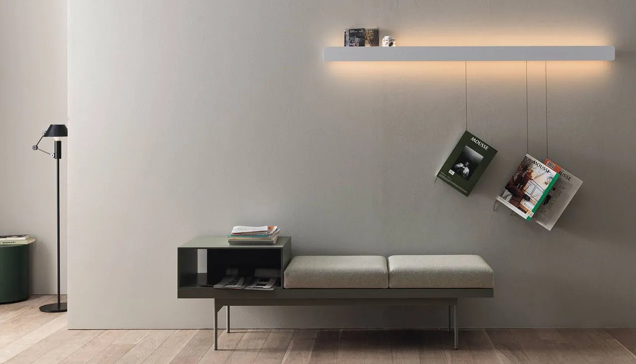 La mensola Groove di Caccaro ha una doppia funzione, infatti permette di illuminare l’ambiente e di esporre oggetti e piccoli quadri. La struttura in laccato opaco rugiada dà vita ad un raffinato contrasto con la parete color tortora ed è dotata di un doppio led dimmerabile che diffonde una luce soffusa sul muro. Misura L 183 x P 8,6 x H 9,2 cm. Prezzo 1.006 euro + Iva. https://www.caccaro.com