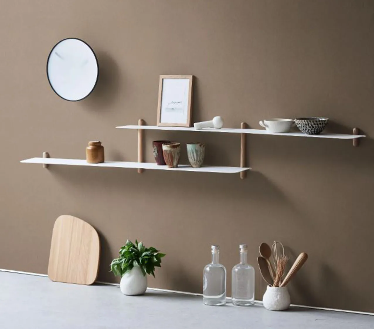 Abbina due piani sfalsati la grande mensola Nivo di Gejst in vendita su Westwing che sta bene in cucina per esporre stoviglie e accessori. È composta da due ripiani in acciaio verniciato bianco con sostegni in legno di quercia. Misura L 172 x P 16 x H 25 cm. Prezzo 149 euro. https://www.westwing.it