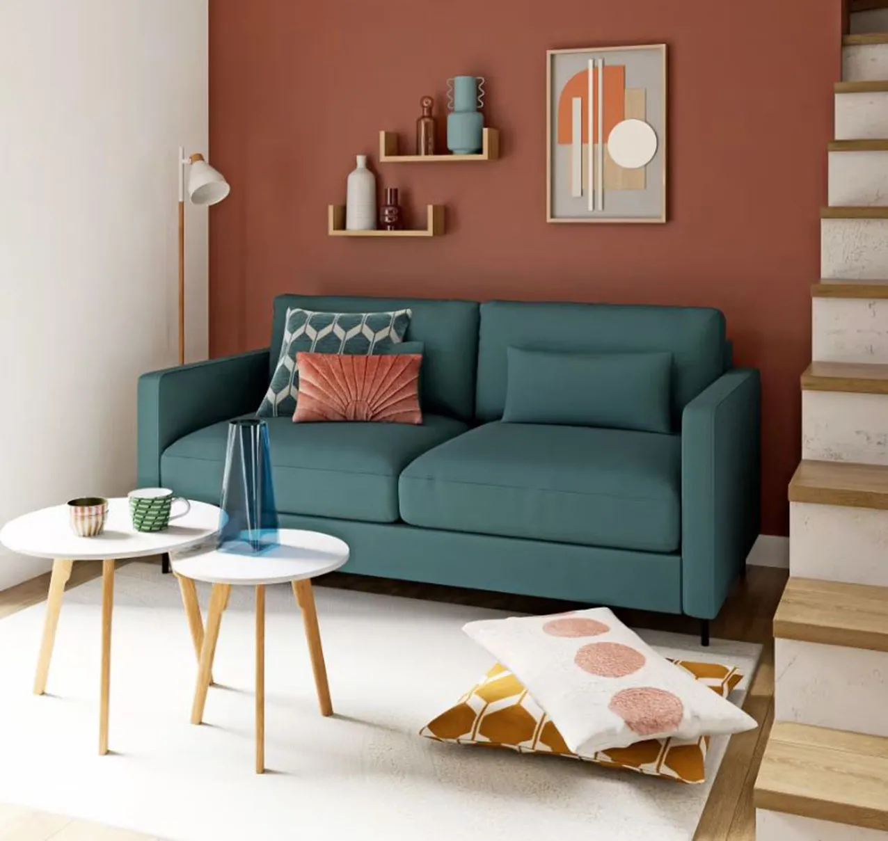 Arredano la parete dietro il divano la coppia di mensole Rachele di Mobili Fiver che permettono di esporre quadri e oggetti: sono realizzate in nobilitato melaminico di alta qualità nella variante Quercia. Misurano L 80 x P 17 x H 8 cm. Prezzo 46,66 euro (per il set da 2 pezzi). https://www.mobilifiver.com