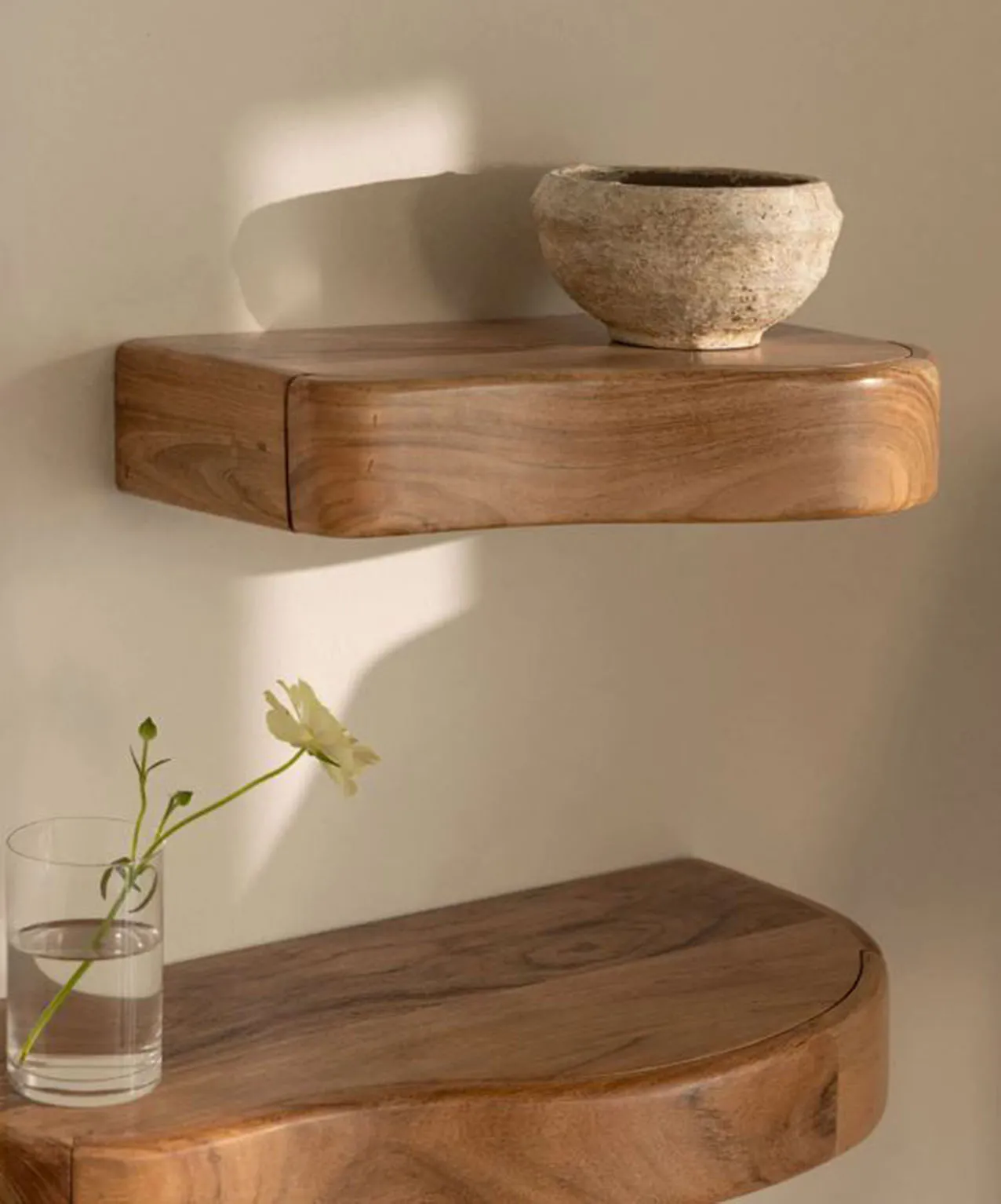 Sono dotate di un comodo cassettino le mensole sagomate Nireimi di Sklum: sono completamente realizzate in legno di acacia che le “impreziosisce” con la venatura e sono disponibili in tre formati. Misurano L 40/60 x P 25 x H 8 cm. Prezzo a partire da 60,95 euro. https://www.sklum.com