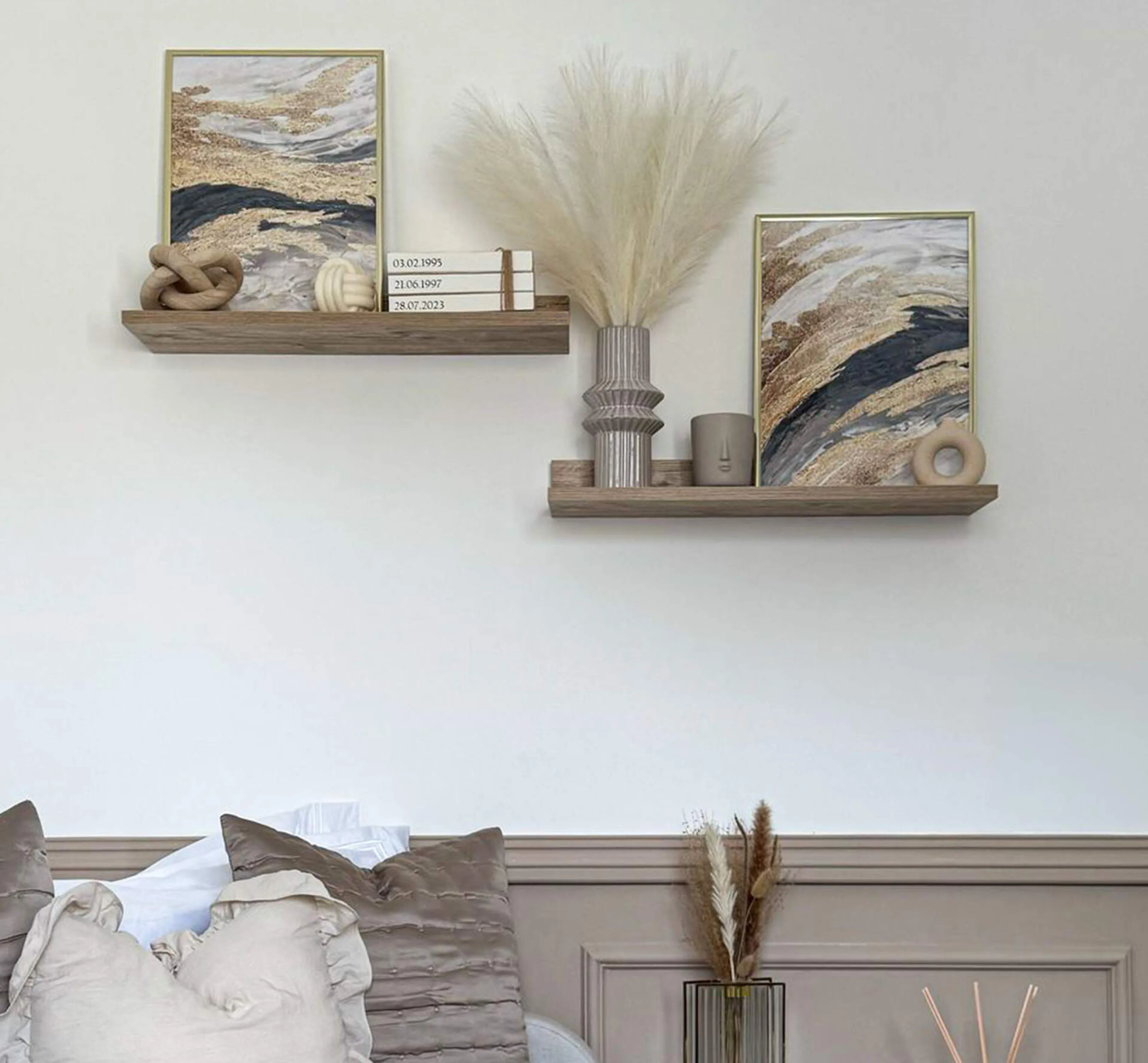 Tante mensole abbinate “vestono” la parete in modo ricco ed elegante. Le composizioni possono essere create allineandole in altezza o affiancandole o mettendole sfalsate, a seconda degli spazi e degli ambienti e soprattutto degli arredi che sono collocati nella parte inferiore della parete.
