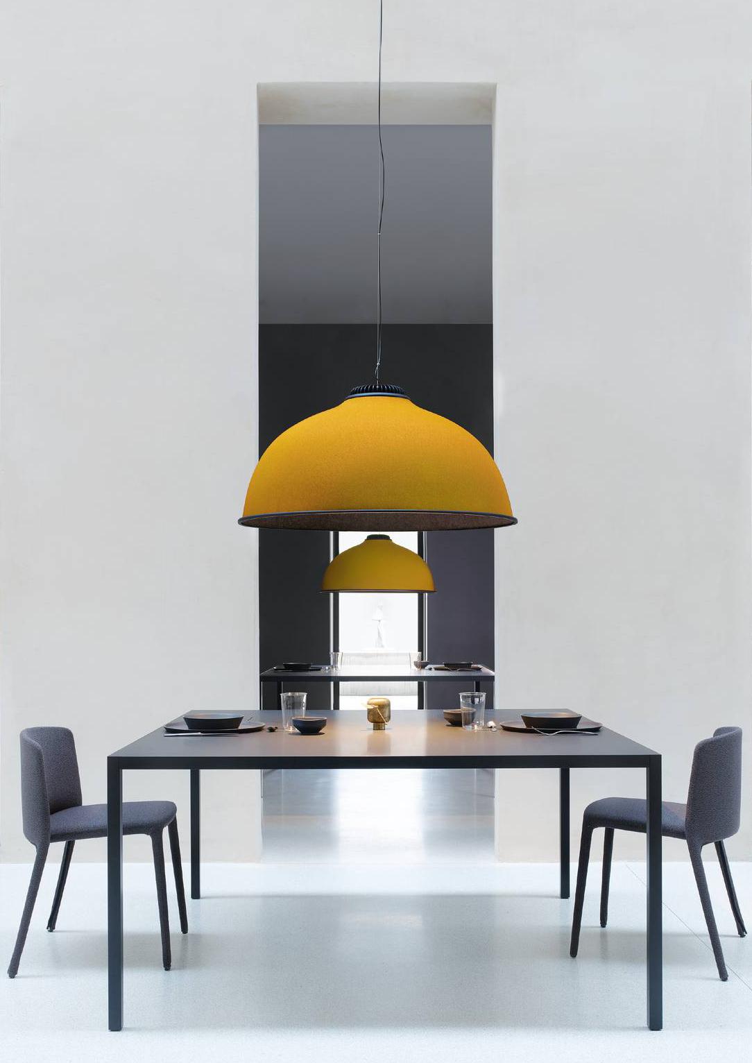 La nuova sospensione acustica Farel di Luceplan è stata ripensata con un materiale fonoassorbente abbinato a un tessuto ocra riciclato al 100% e ricavato da componenti plastiche ritrovate nelle aree costiere. https://www.luceplan.com – Fuorisalone, Luceplan Showroom, Corso Monforte 7, Milano