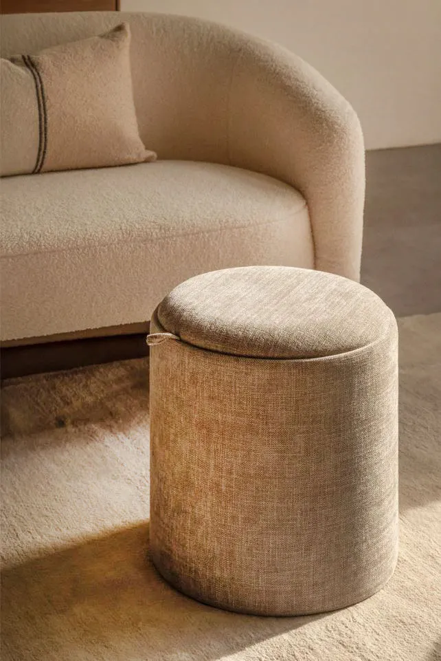 Come poggiapiedi tra i divani. Ha una forma cilindrica il pouf contenitore Berkeleni di Sklum che è completamente rivestito in tessuto in una colorazione in gradazione con il divano. Permette di avere a portata di mano un plaid, gli accessori elettronici affinché siano ben protetti o i giocattoli per i più piccoli. Inoltre, basta girare il coperchio superiore per trasformarlo in un pratico vassoio in legno di frassino. Misura Ø 40 x H 44 cm. Prezzo 80,95 euro. https://www.sklum.com