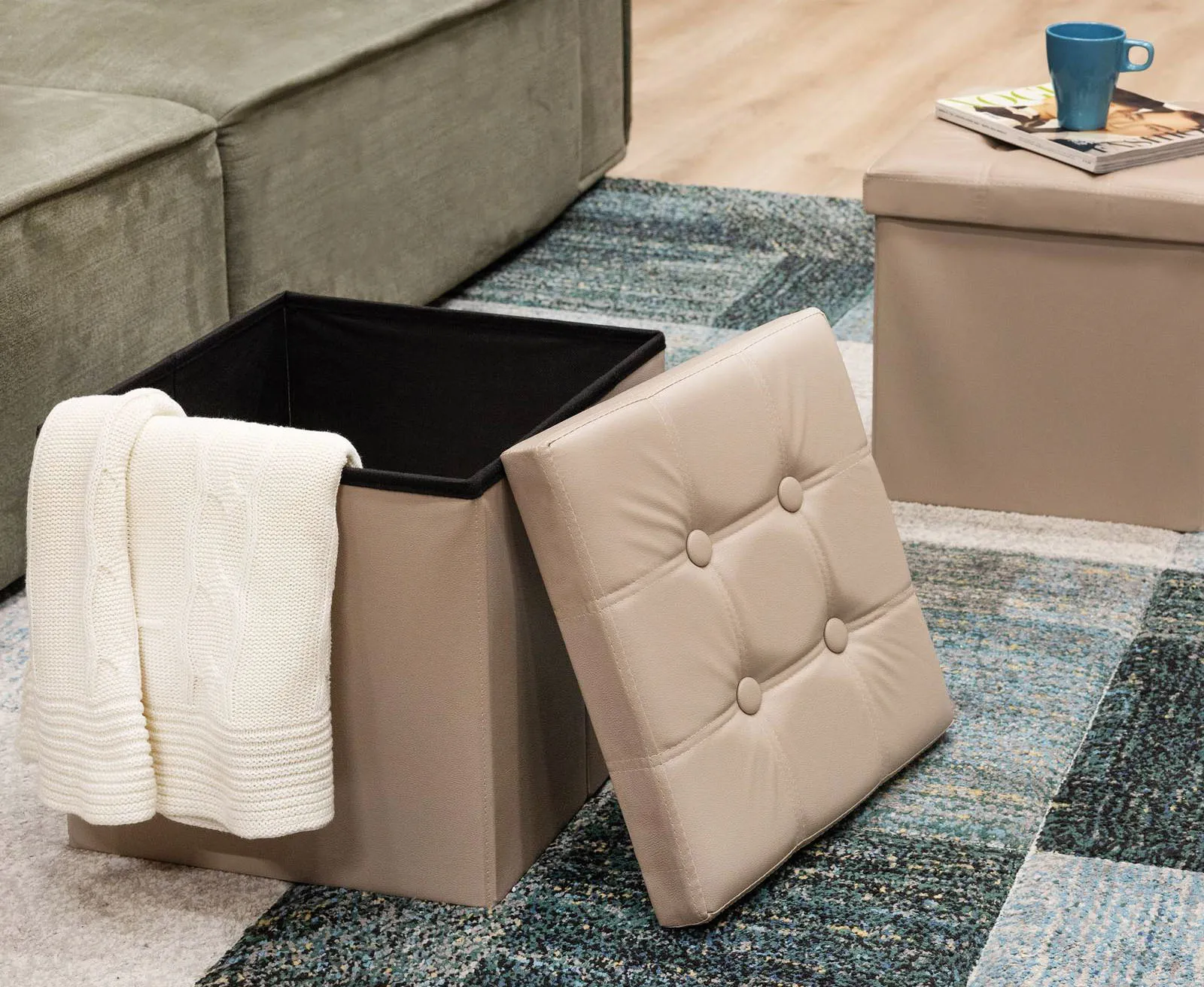 Coordinati. La coppia di pouf contenitore di Home Reflections in vendita su QVC sono rivestiti in simil pelle nella raffinata colorazione Tortora. Il resistente coperchio/seduta è impreziosito da una lavorazione capitonné. Inoltre, sono pieghevoli per riporli agevolmente quando non servono. Misurano L 38 x P 38 x H 38 cm. Prezzo 49,90 euro (per il set da 2 pezzi). https://www.qvc.it
