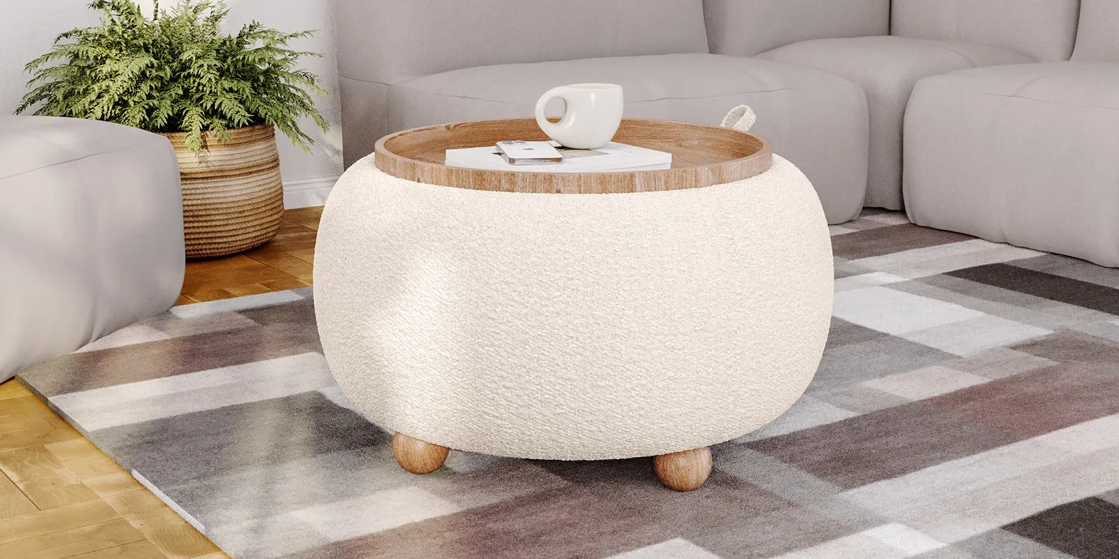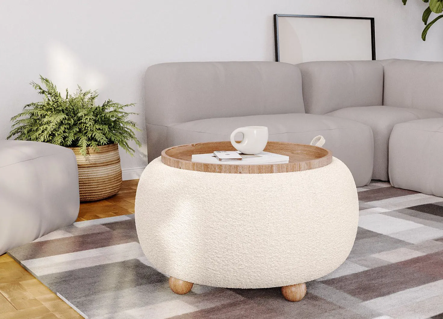 In salotto con vassoio. Il grande pouf contenitore Doze di Deghi può essere usato come seduta aggiuntiva o come tavolino basso davanti ai divani grazie alla presenza di un vassoio amovibile in legno chiaro come i piedini rotondi. La struttura in MDF è imbottita in schiuma ad alta densità e rivestita in tessuto bouclé bianco. Misura Ø 67 x H 38 cm. Prezzo 170 euro. https://www.deghi.it