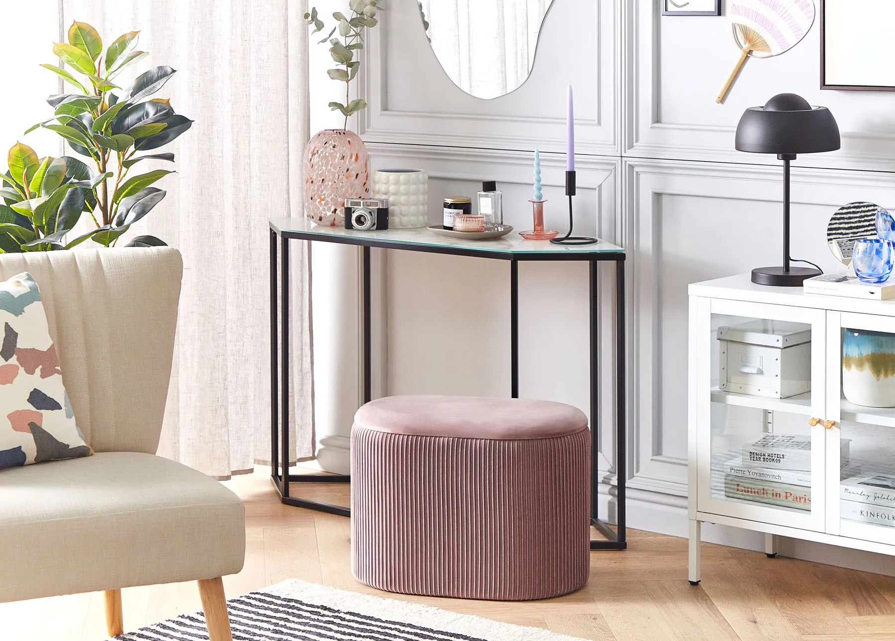 Nel living davanti al tavolo consolle. Velluto rosa per il pouf Richland di Beliani che si trasforma nel protagonista della zona giorno anche grazie alla raffinata lavorazione capitonné verticale sui lati. Una volta sollevato il coperchio, sagomato e imbottito, si accede all’ampio vano portaoggetti. Misura L 55 x P 35 x H 41 cm. Prezzo 89,99 euro. https://www.beliani.it