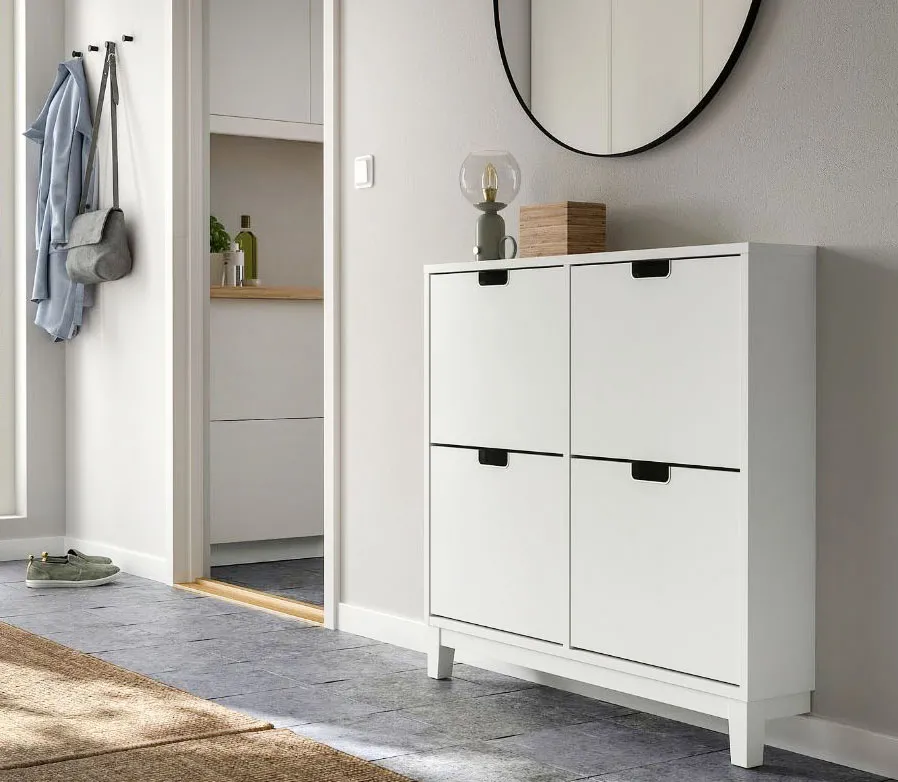 Quattro scomparti ventilati e una profondità ridotta per la scarpiera bianca STÄLL di Ikea Italia; le maniglie intagliate sono rifinite da un bordo in metallo che ne aumenta la resistenza e si trasforma in un elemento decorativo. Misura L 96 x P 17 x H 90 cm. Prezzo 119 euro. https://www.ikea.com