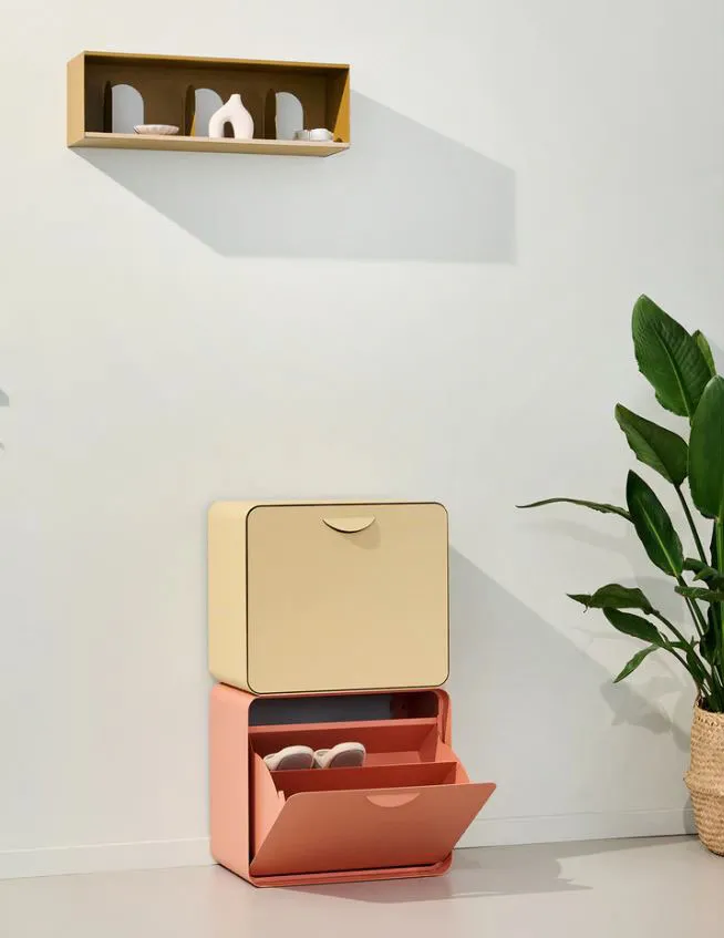 La scarpiera componibile Maru di HIRO è composta da due elementi in acciaio verniciato, disponibili in sei varianti di colore, da comporre a piacere nelle tonalità e in verticale o in orizzontale; inoltre, può anche essere appesa a parete. Lo sportellino a ribalta si apre per mezzo di una maniglia minimale. Un modulo misura L 47 x P 29 x H 41 cm. Prezzo 209 euro (per un singolo modulo). https://hiro.design