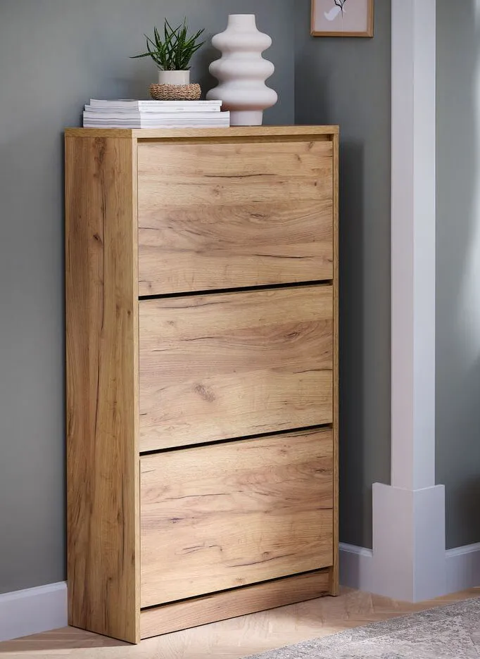 Si sviluppa verticalmente la scarpiera LIMFJORDEN di JYSK che ha la superficie in melamina nella finitura Rovere selvatico naturale con venature a vista che le dona un aspetto piacevolmente rustico e materico. È caratterizzata da tre scomparti chiusi da ante a ribalta senza maniglie. Misura L 72 x P 27 x H 128 cm. Prezzo 115 euro. https://jysk.it