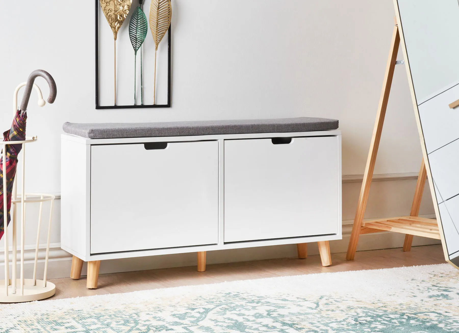 Grazie alla presenza del cuscino grigio la panca/scarpiera Mineral di Beliani può essere usata anche come comoda e pratica seduta da posizionare all’ingresso. Ha la struttura in Melammina bianca e i piedini in legno chiaro. Misura L 98 x P 25 x H 52 cm. Prezzo 139 euro. https://www.beliani.it