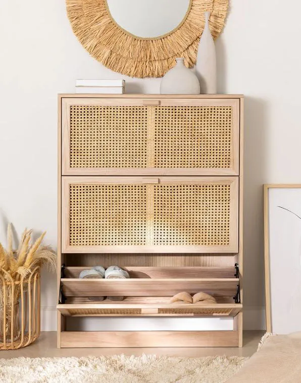 Ha la struttura realizzata in legno di paulownia, con una colorazione chiara, la grande scarpiera Ralik di Sklum: è dotata di tre ante a ribalta in rattan con un aspetto molto decorativo. Misura L 83 x P 28 x H 115 cm. Prezzo 339,95 euro. https://www.sklum.com