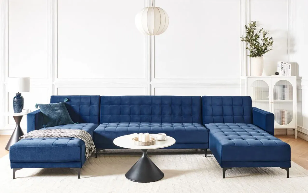 Ben cinque posti per il divano Aberdeen di Beliani con una forma a U che dà vita ad una zona conversazione/relax. È rivestito in velluto blu idrorepellente e ha lo schienale regolabile in tre posizioni. Misura L 322 x P 189/140 x H 83 cm. Prezzo 1.089 euro. https://www.beliani.it