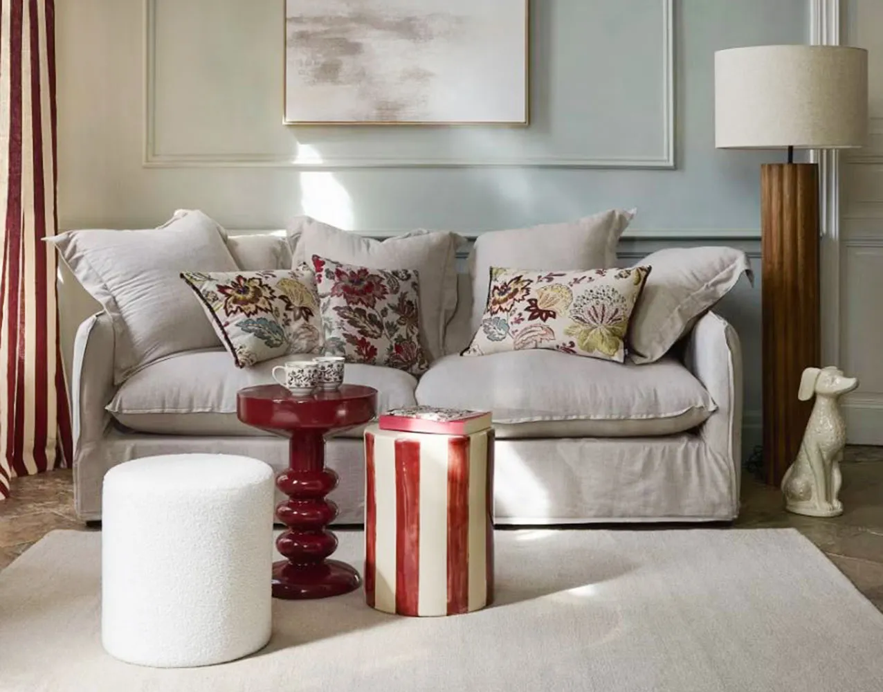 È rivestito in tessuto, misto viscosa, effetto lino stropicciato beige Barcelone di Maisons du Monde, il divano con un aspetto classico; è completamente sfoderabile. I cinque cuscini dello schienale ne aumentano il comfort. Misura L 207 x P 90 x H 86 cm. Prezzo 899 euro. https://www.maisonsdumonde.com