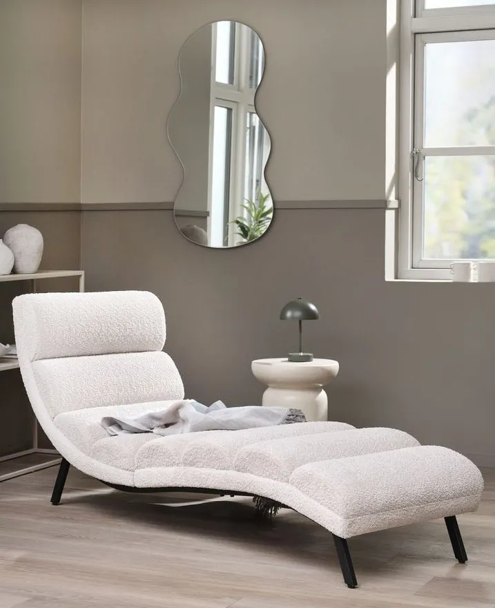 Ha i cucini di seduta e lo schienale imbottiti in schiuma la chaise longue Lindelse di Jysk: è completamente rivestita in tessuto teddy (un tessuto sintetico a pelo corto o medio, con una superficie leggermente arricciata e tridimensionale che richiama al tatto un effetto peluche) beige che crea un raffinato contrasto con i piedini in metallo nero. Misura L 171 x P 73 x H 61 cm. Prezzo 249 euro. https://jysk.it