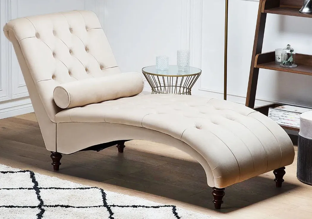 Il velluto beige del rivestimento sottolinea lo stile elegantemente retrò della chaise longue Muret di Beliani; lo schienale è caratterizzato da una lavorazione capitonné in stile Chesterfield. L’imbottitura in gommapiuma, il cuscino cilindrico e il tessuto liscio ne aumentano il comfort. Misura L 163 x P 72 x H 87 cm. Prezzo 369,99 euro. https://www.beliani.it