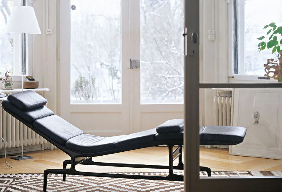 Iconica e senza tempo la chaise longue Soft Pad Chaise di Vitra disegnata da Charles & Ray Eames nel 1968: è composta da sei cuscini, uniti tramite cerniere, rivestiti in pregiata pelle nera e fissati al telaio in alluminio verniciato a polvere cioccolato. Sono inclusi due cuscini mobili per il massimo comfort. Misura L 192 x P 45 x H 73 cm. Prezzo a partire da 7.240 euro. https://www.vitra.com