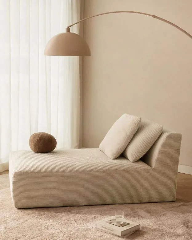 Può essere utilizzato anche da solo come chaise longue il modulo Temple di Sklum: ha una forma semplice e squadrata ed è rivestito in velluto a coste Beige Lin. È corredato di un cuscino coordinato sfoderabile che ne aumenta il comfort. Misura L 90 x P 165 x H 82 cm. Prezzo 339,95 euro. https://www.sklum.com