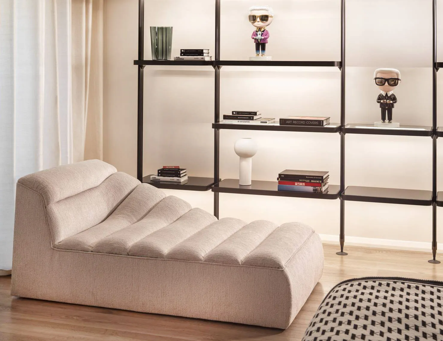 La chaise longue Wellen di KARL LAGERFELD MAISON ha una forma compatta e morbida, sottolineata dal basso schienale angolare; il rivestimento è disponibile in diverse finiture e colorazioni. Misura L 66 x P 147 x H 86 cm. Prezzo a partire da 7.460,30 euro (per la finitura base). https://karllagerfeldmaison.com