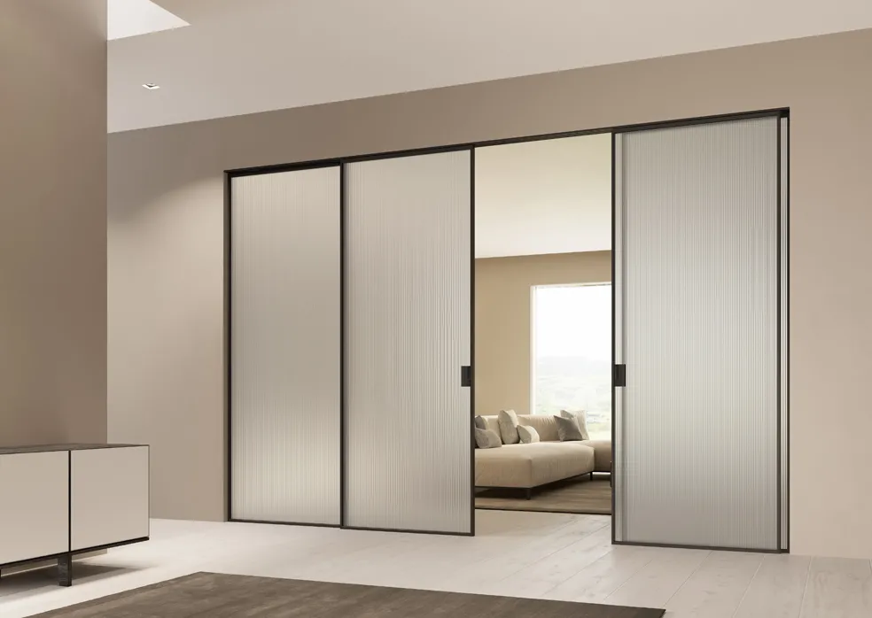 Trasparenze, riflessi e texture diventano strumenti compositivi al pari dei materiali e delle geometrie, che offrono la possibilità di creare continuità visiva senza rinunciare alla discrezione. In questa prospettiva si inseriscono le porte scorrevoli e i sistemi modulari in vetro, che offrono una libertà progettuale pressoché illimitata: dividono senza separare, definiscono senza interrompere.