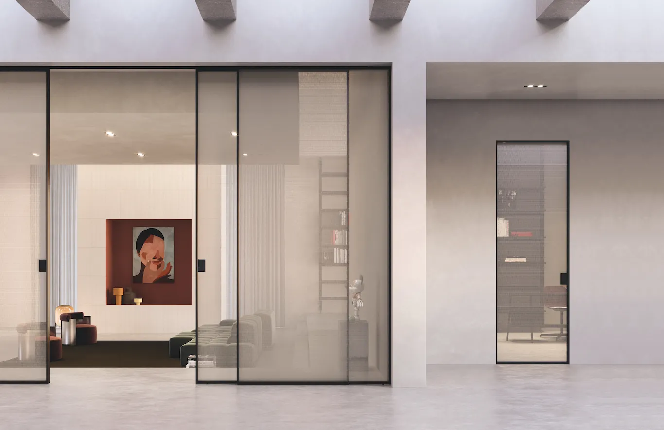Nel linguaggio dell’interior contemporaneo, la porta non è più soltanto un elemento di chiusura ma un componente architettonico in grado di ridefinire la percezione dello spazio. Le soluzioni in vetro di grandi dimensioni estendono la percezione dello spazio, lasciano filtrare la luce e costruiscono continuità fluide tra ambienti contigui, trasformando la soglia in una superficie di relazione.