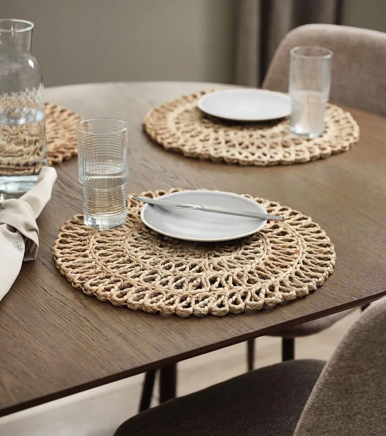 Pura juta per le tovagliette HVIDPIL di Jysk che ricordano un pizzo. Possono essere posizionate direttamente sul tavolo per una apparecchiatura informale o su una tovaglia bianca come segnaposto. Misurano Ø 38 cm. Prezzo 5 euro cad. https://jysk.it