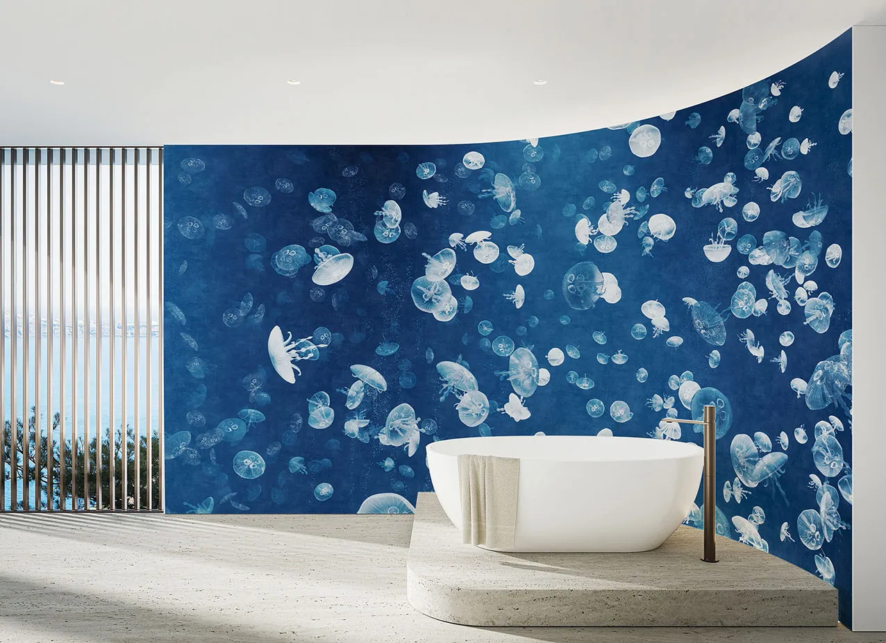 La carta da parati per bagni con meduse fluttuanti nell’acqua Sogni di WallPepper®/Group – in versione WP/H2O – è in fibra di vetro, con superficie liscia, idrorepellente, antibatterica, lavabile, resistente alle macchie. https://www.wallpeppergroup.com