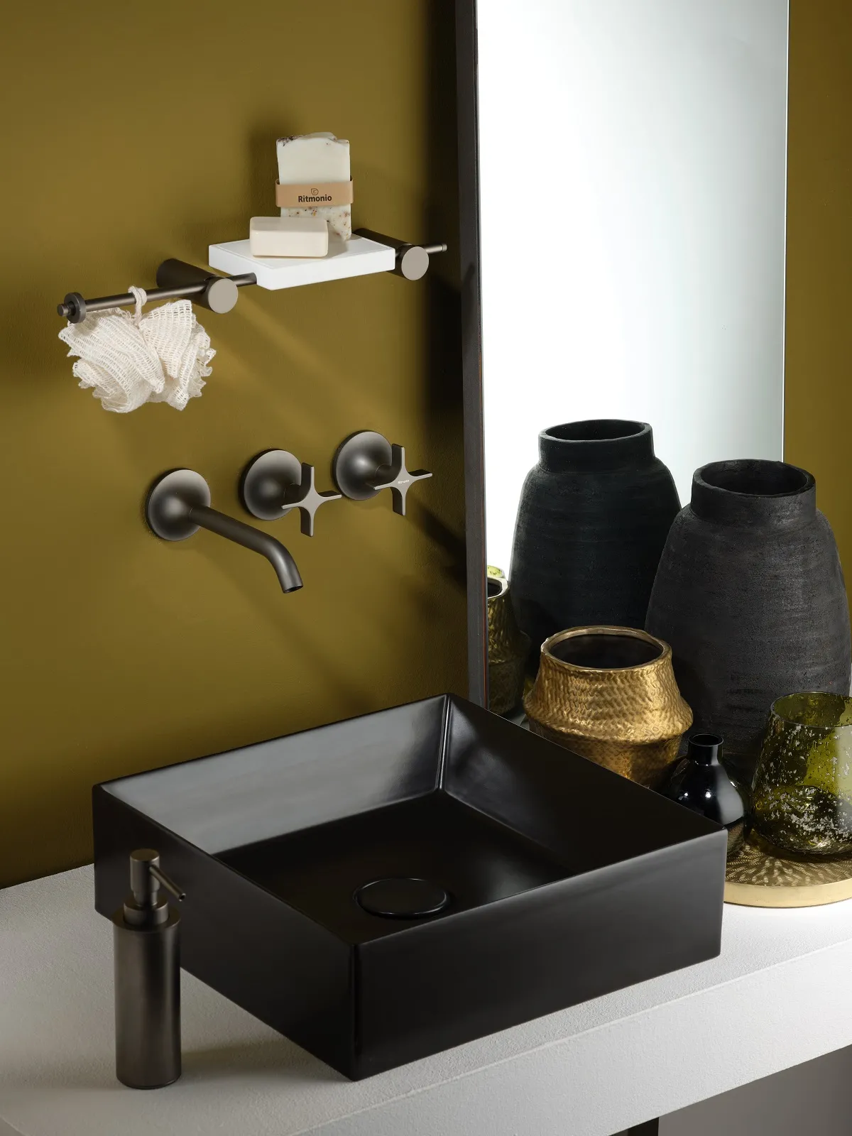 È da parete il gruppo a tre fori a incasso per lavabo con manopole a stella Diametro35 Cross di Ritmonio. La canna ha una lunghezza di 23,7 cm. https://www.ritmonio.it