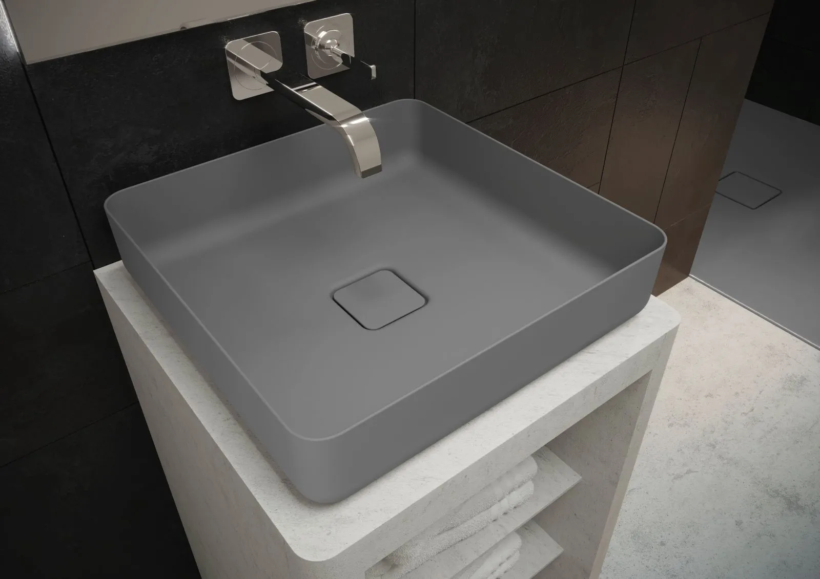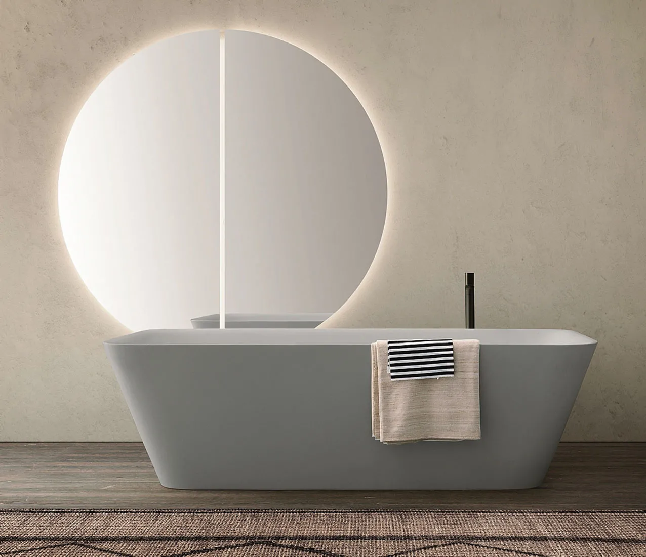 Linee essenziali e geometriche per la vasca Milord di Archeda, realizzata in Geacryl®, materiale composito con cariche minerali naturali e polimeri leganti di alta qualità. Qui è nel colore matt Finestra, un grigio opaco, con piletta Click-Clack dal coperchio in tinta. Misura L 170 x P 70 x H 50 cm. https://www.archeda.eu