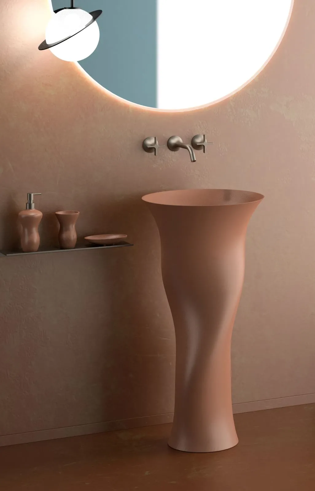 Ha forme sinuose il lavabo free-standing Dame di Glass Design ispirato al mondo della moda in Vetrofreddo®. La collezione è proposta in un’ampia gamma di colori, nella foto nel nuovo colore Mocha Mousse. Misura del diametro della bocca lavabo 45 cm/del diametro della base a terra 26 cm. L’altezza è di 90 cm. https://www.glassdesign.it