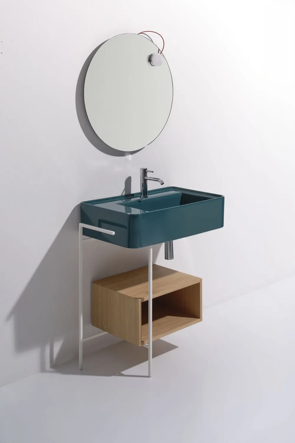 La base lavabo della collezione DES Evolution di Cerasa è dotata di cassetto e cassetto interno. Laccata RAL 6012 opaco, è rivestita, come anche il lavabo d’appoggio, con Resina Stone Deckblend nella finitura Verde Alpi. Si tratta di una miscela di eco-malte applicate su una superficie abbinando un trasferimento di pigmenti a base acrilica. Il risultato è una superficie materica, continua su tutti i lati, che replica nei colori e nella texture la pietra o marmo selezionati. La superficie è resa resistente e idrorepellente grazie all’applicazione di una soluzione bicomponente trasparente. La stesura della malta avviene in modo manuale e la successiva decorazione è assimilabile all’antica tecnica dell’affresco. Misura L 105 x P 51 x H 48 cm. https://www.cerasa.it