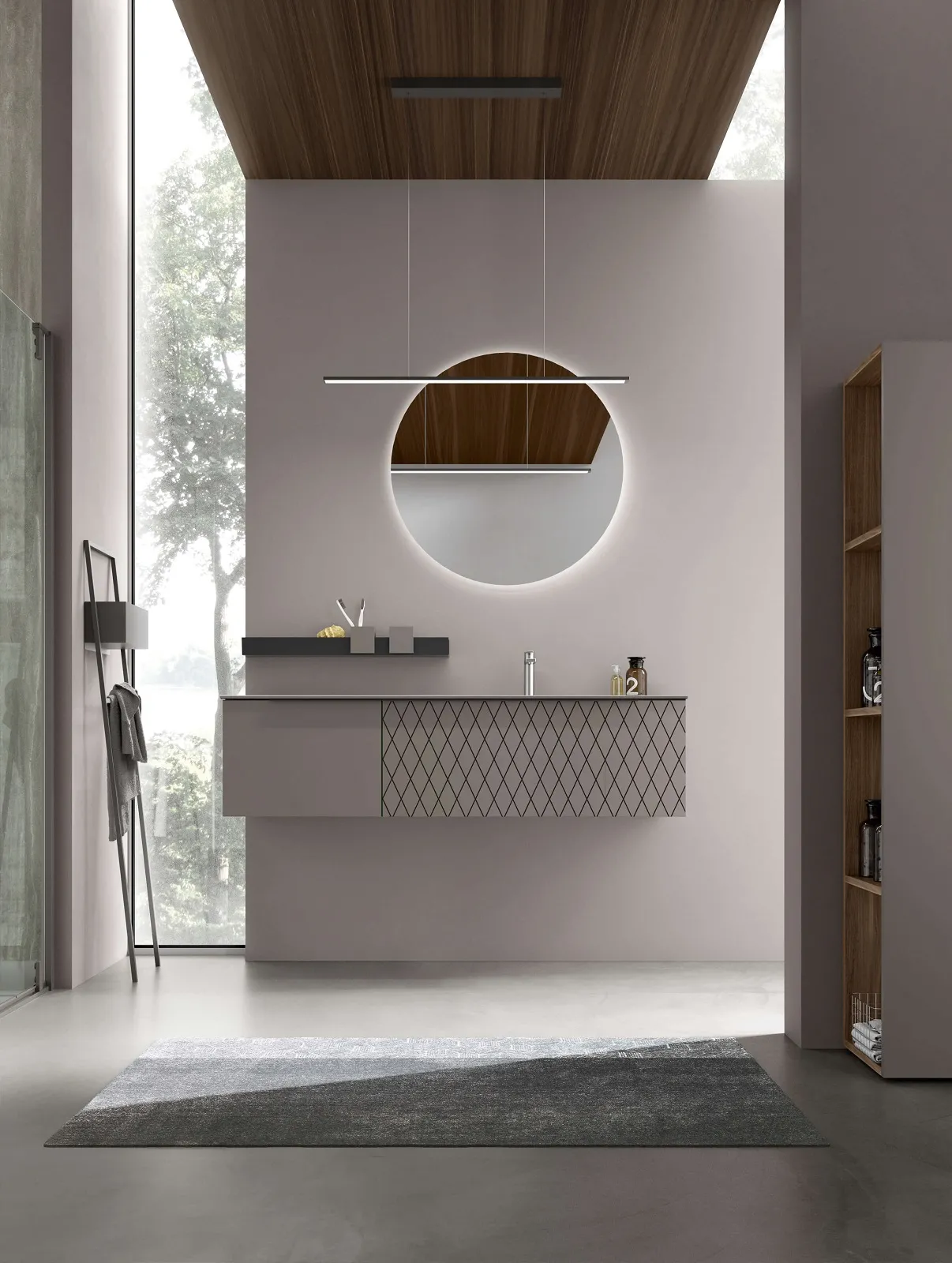 Una trama a rombi veste l’anta del mobile lavabo sospeso con vasca integrata della collezione Pollock Trame di Arcombagno. La scocca e il frontale sono nel colore Taupe opaco. Misura L 145 x P 50,5 cm. https://www.arcombagno.com