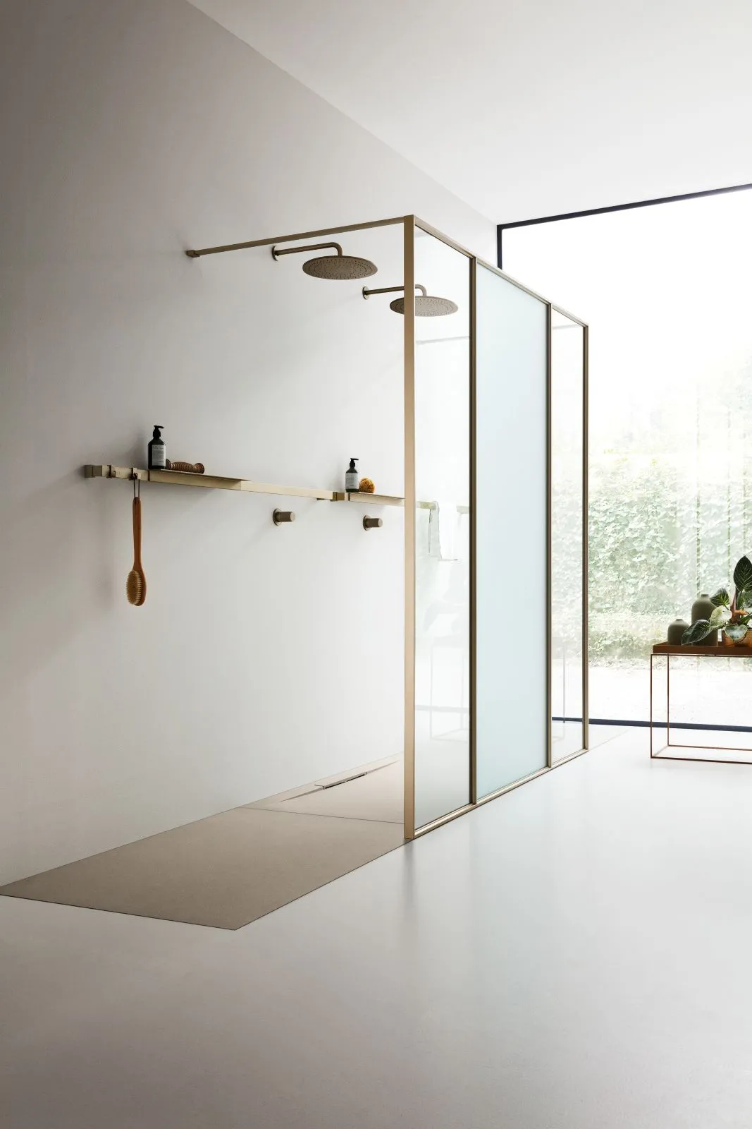 È intelaiato su tutti e quattro i lati il box doccia Horizon walk-in di Arblu. Disponibile sia in versione a soffitto, dove può raggiungere un’altezza standard di 300 cm sia con braccetto con un’altezza standard di 207 cm. L’altezza delle pareti doccia è personalizzabile a piacimento. Il vetro è disponibile in svariate finiture: Trasparente, Bronzo Glam, Grigio Europa, Satinato, Serigrafato e Specchiato. Vi è la possibilità di integrare barre attrezzabili sia all’interno sia all’esterno oppure metà interno e metà esterno. Le barre si possono accessoriare con mensole portaoggetti in metallo, ganci appendi asciugamani o portaoggetti laterali. Il modello in foto ha finiture metal Gold Sand, vetro trasparente e vetro satinato. Misura L 200 x H 207 cm. ww.arblu.it