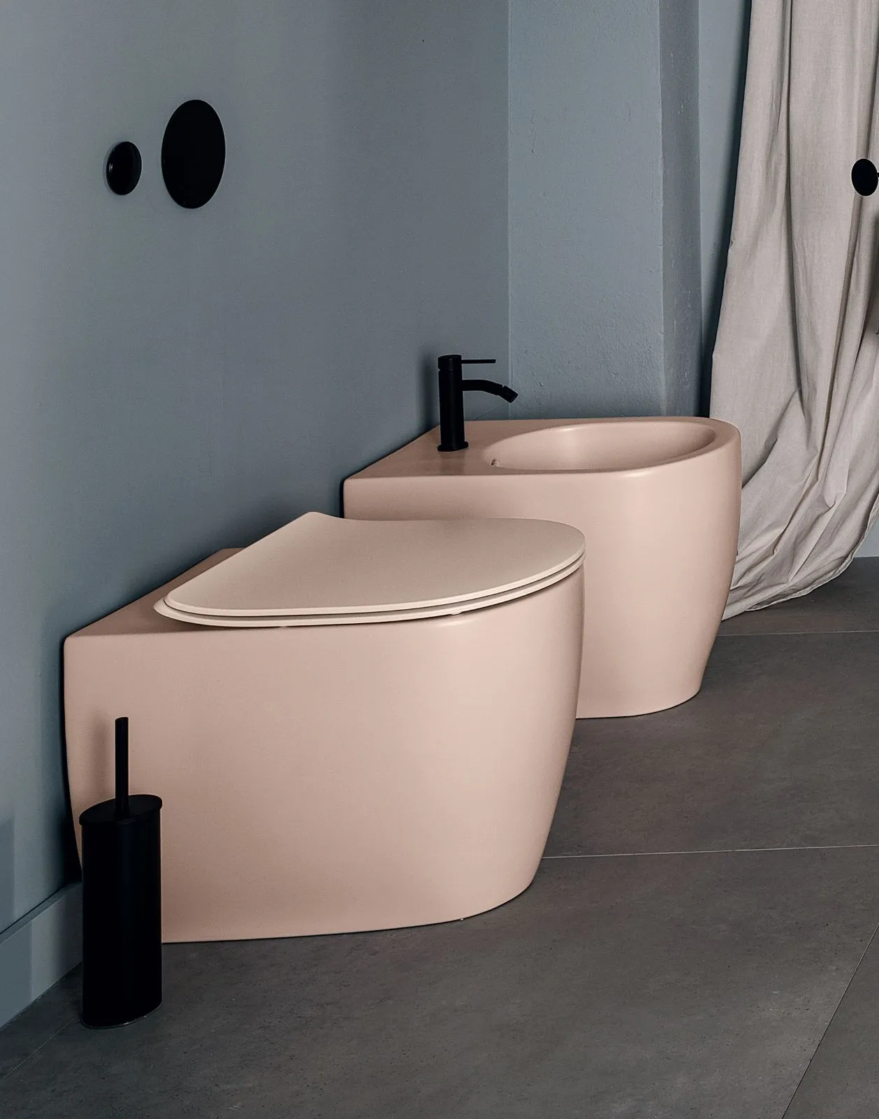 La coppia di sanitari a terra Moon di Scarabeo è in ceramica smaltata con finitura Antique Pink. Il vaso è dotato di sistema Clean Flush ed Eco Water Saving Plus 2/4lt e si completa di sedile in termoindurente con chiusura rallentata e sgancio rapido nella stessa finitura della ceramica. Misurano, cadauno, L 36 x P 54,5 cm. https://scarabeoceramiche.it/