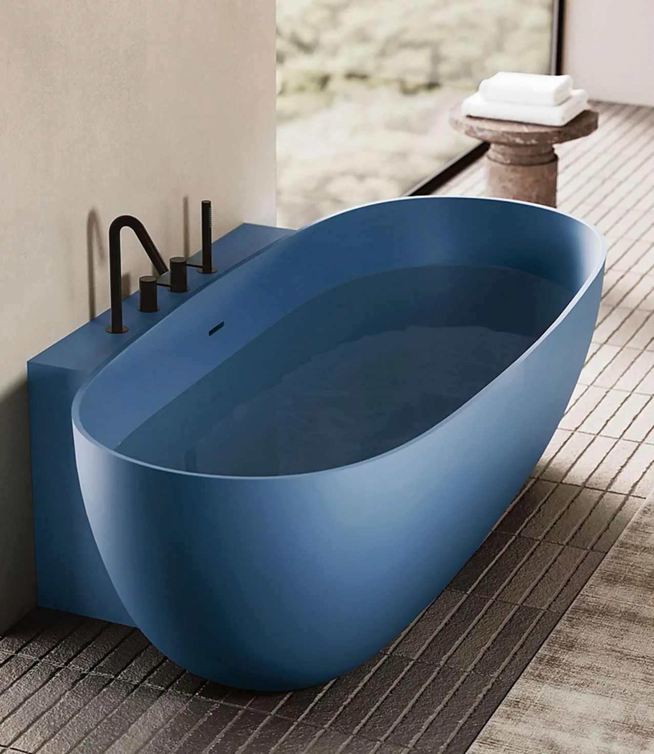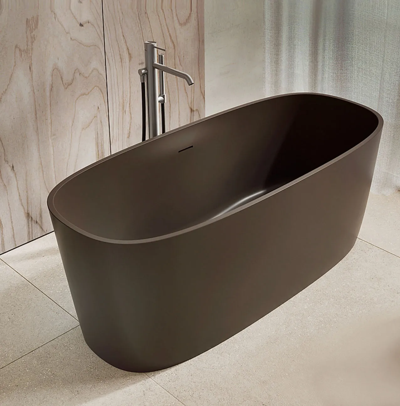 Liora di Alice Ceramica ha forma ovale ed è in Cristalplant® dalla superficie soft touch, effetto pietra levigata. Qui è full color nel colore Caffè opaco, disponibile anche in altri otto colori, tra cui Malva, Zenzero, Laguna, Rosa, Sabbia. Misura L 150 x P 65 x H 55 cm. https://www.aliceceramica.com